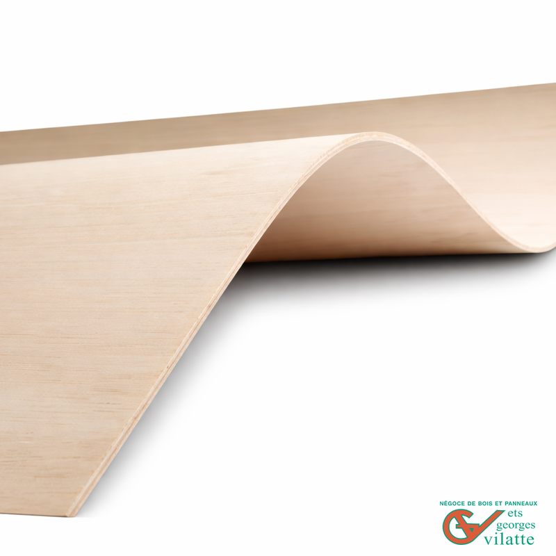 Le contreplaqué cintrable Souplex est fabriqué à partir de placages de fromager (kapokier), une essence reconnue pour sa souplesse et sa capacité au cintrage. Sa structure permet de cintrer le panneau sans rupture, selon le sens du fil, pour répondre aux contraintes des projets arrondis.